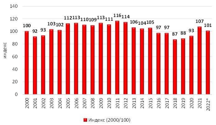 Слика 1. Финална (крајна) потрошувачка на енергија во домаќинствата по глава на жител, изразена во изразена воиндексни поени (индекс 100 во 2000 година) за период 2000 - 2022 година