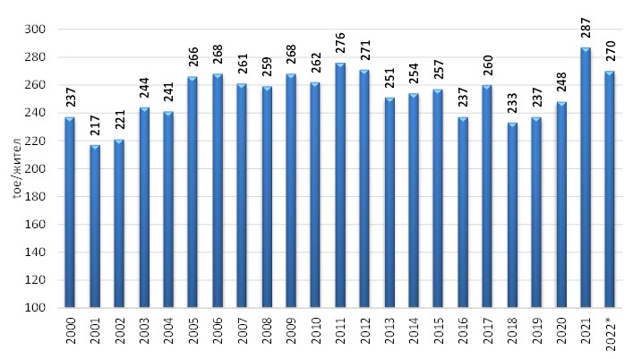 Што се однесува финалната (крајната) потрошувачка на енергија во домаќинствата по глава на жител,во 2000 година изнесуваше 237 toe (индекс 100), додека во 2022 година таа е 270 toe (индекс 100,7) што претставува зголемување на вредноста на овој индикатор за 14%. Во 2022 година во споредба со 2021 година вредноста на овој индикатор е намалена за 6%.