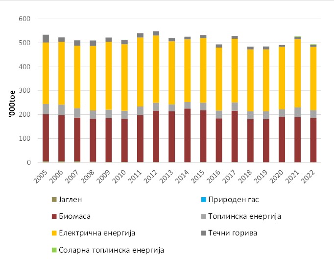 Од следниот графикон може да се забележи трендот на потрошувашката на различни видови на горива во овој сектор за период 2005 до 2022 година, за кој се достапни расположливи податоци