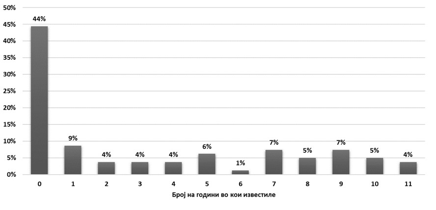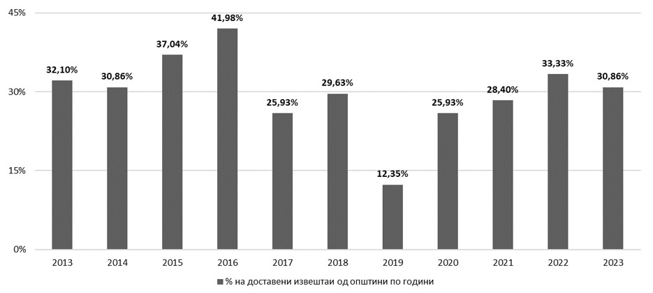 Од вкупно 81 општина која има обврска за доставување извештаи во просек годишно се доставуваат по 24 извештаи или само 29,3% општини доставуваат. Почнувајќи од 2013 па се до 2023 година трендот на доставувањето на извештаите по години има тренд на намалување, со пик во 2016 година. Исто така голем процент на општините континуирано не ја исполнуваат обврската за годишна достава на извештаите, односно 44% од вкупниот број на општини, ниту еднаш не доставиле извештај.