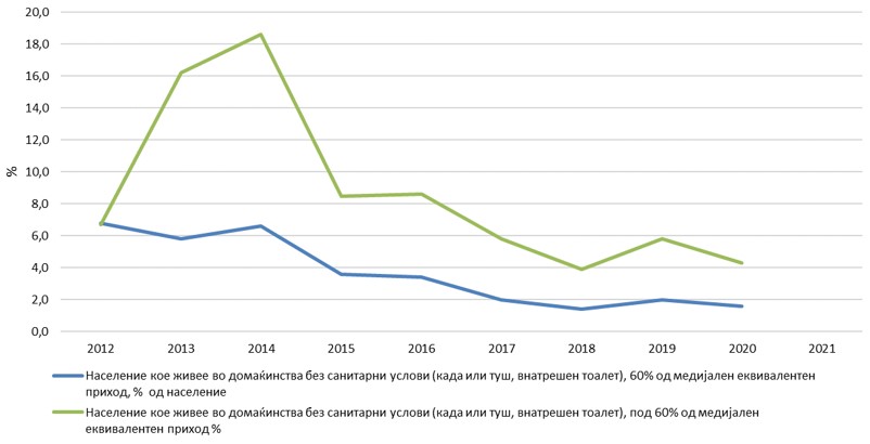 Население кое живее во домаќинства без санитарни услови (када или туш, внатрешен тоалет), под 60% од медијален еквивалентен приход,