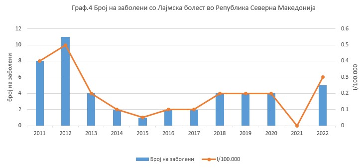 - Број на нови случаи на заболување со болеста Lyme borreliosis сметано на 100 000 жители во една година во Република Северна Македонија.
