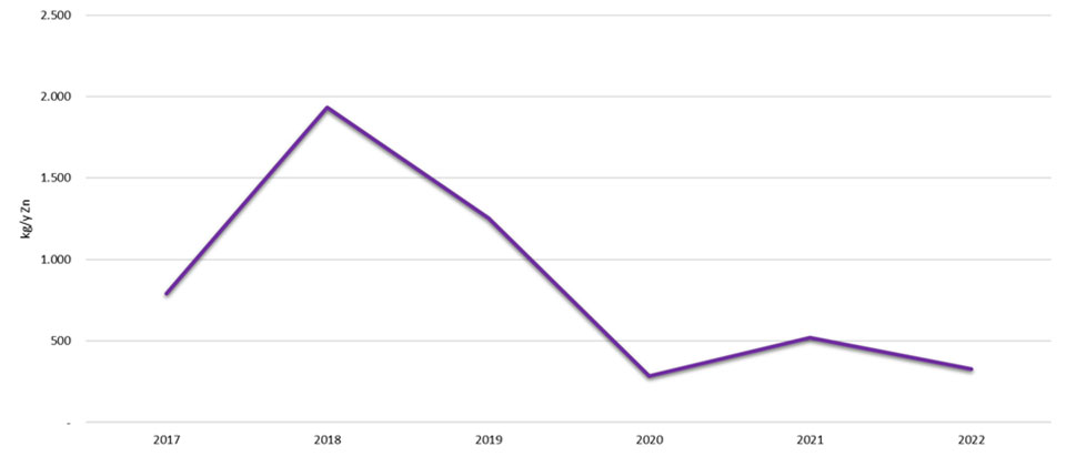 На Графикон 5 прикажана е количината на емисии на цинк во индустриски отпадни води претставен во kg/год за периодот 2017-2022 година.