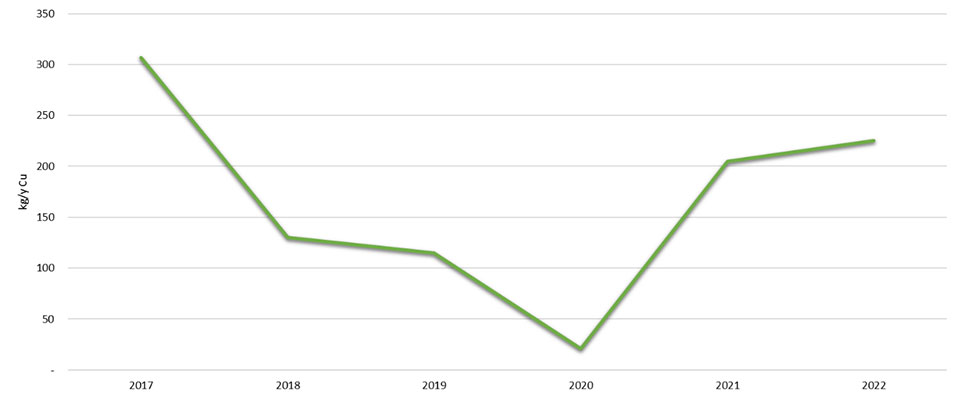 Нерамномерен тренд се бележи во количините на емисии на бакар во индустриските отпадни води во дадениот период, со значително намалување на емисиите од 306 kg/год како резултат на воведување на најдобри достапни техники во процесот на добивање на бакарен концентрат и катоден бакар, следење на емисионите стандарди за емисии во отпадните води како и намаленото производство во рудникот за бакар во 2019-2020 година, кога се и најниските емисии односно количина од 20,93 kg/год. Зголемувањето на емисиите на бакар во 2021 и 2022 кога количините на бакар во индустриската вода изнесувал 225,19 kg/год се должи на активирање на нов рудник за производство на бакар и зголемување на капацитетот на рудникот за бакарен концентрат и катоден бакар.