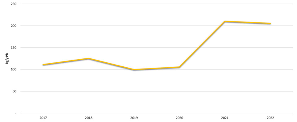 Нерамномерен тренд се забележува во количините на олово каде за периодот од 2017 – 2020 тие се рамномерни и тие се движат во граници од 111,09 kg/год до 105,49 kg/год. Во последните две години (2021 и 2022) се забележува значителен зголемување на количините на емисии на олово во отпадните индустриски води од 205,77 kg/год. Овој раст се должи на зголемување на капацитетот на инсталацијата за производство на батерии и акумулатори во земјата.