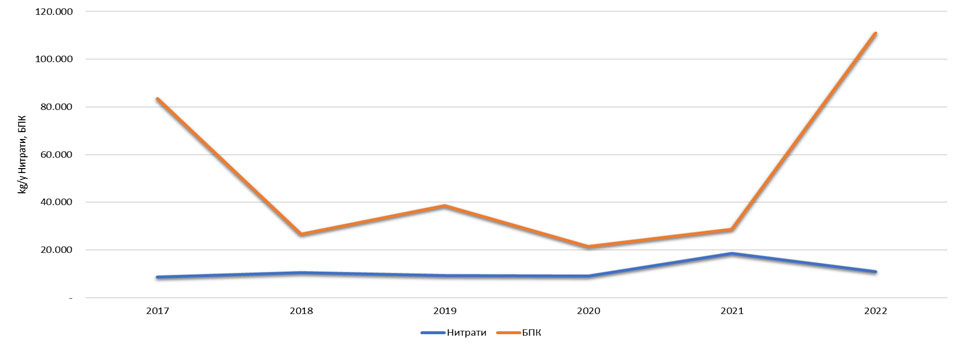 Трендот на нитрати во разгледуваниот период има минимални незначителни промени се до 2021 година, во 2021 година бележи благ пораст на количините кој се должи на истекување отпадни води исцедок од депонии и добиточна храна.