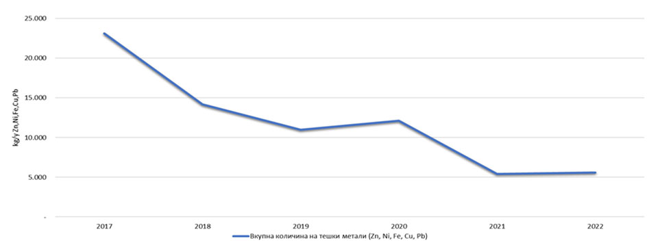 - Вкупното количество на емисии на тешки метали (железо, бакар, олово, цинк и никел) во овој период бележи значително намалување од околу 22.000 kg/год до 5.600 kg/год;
