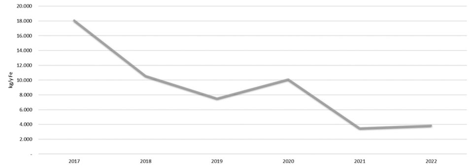 Во 2021 и 2022 година количината на емисии на железо бележи намалување и достигнување минимална количина од 3.846,93 kg/год поради воведување на мерки и техники за намалување на емисиите на загадувачки супстанци од страна на инсталациите, редовниот мониторинг на отпадните води, редовните инспекциски посети и зголемената екипираност и стручност кај инсталациите.
