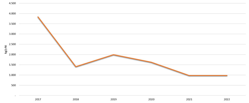 Во периодот од 2017 до 2022 година вкупните емисиите на никел во отпадните води има тренд на намалување. Во 2017 се забележува количина од 3.837,19 kg/год поради работењето на инсталацијата за производство на фероникел која прекинала со работа во следната година. Во 2019 истата компанија излегува од стечај и продолжува со работа во следните години каде и вложува во модернизација на процесот и со тоа се намалуваат и емисиите кои ги создава од работењето за во 2022 количината на никел во индустриски отпадни води изнесува 977,26 kg/год.