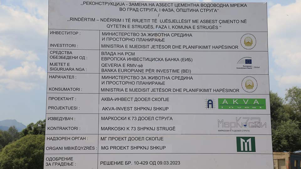 Струга, 27 јуни 2025 Министерството за животна средина и просторно планирање официјално ја започна првата фаза од реконструкцијата и замената на главната водоводна мрежа од азбестни цевки во градот Струга.